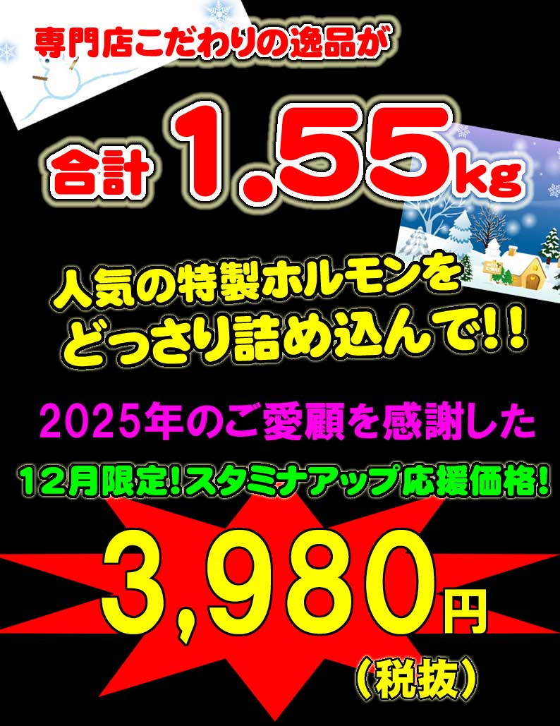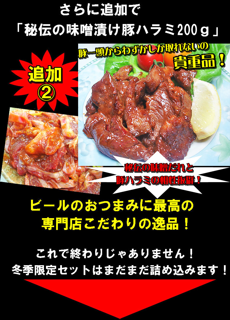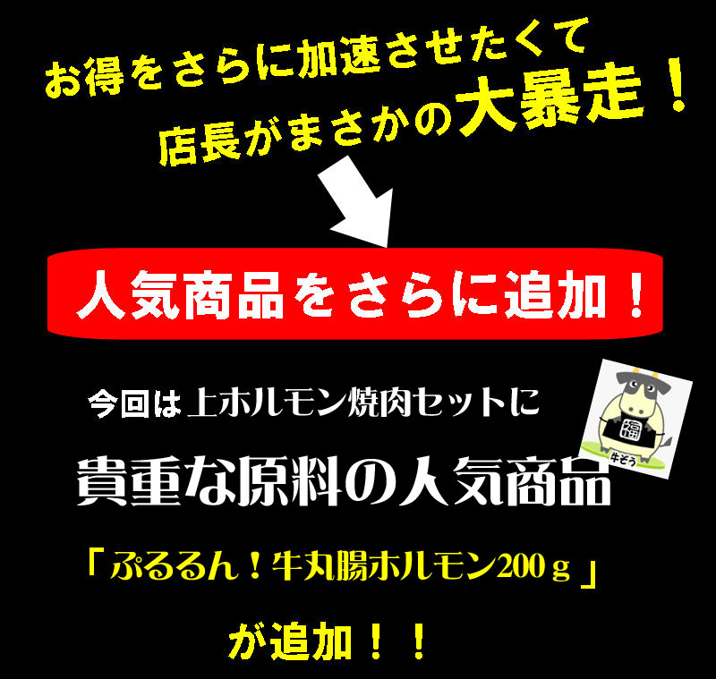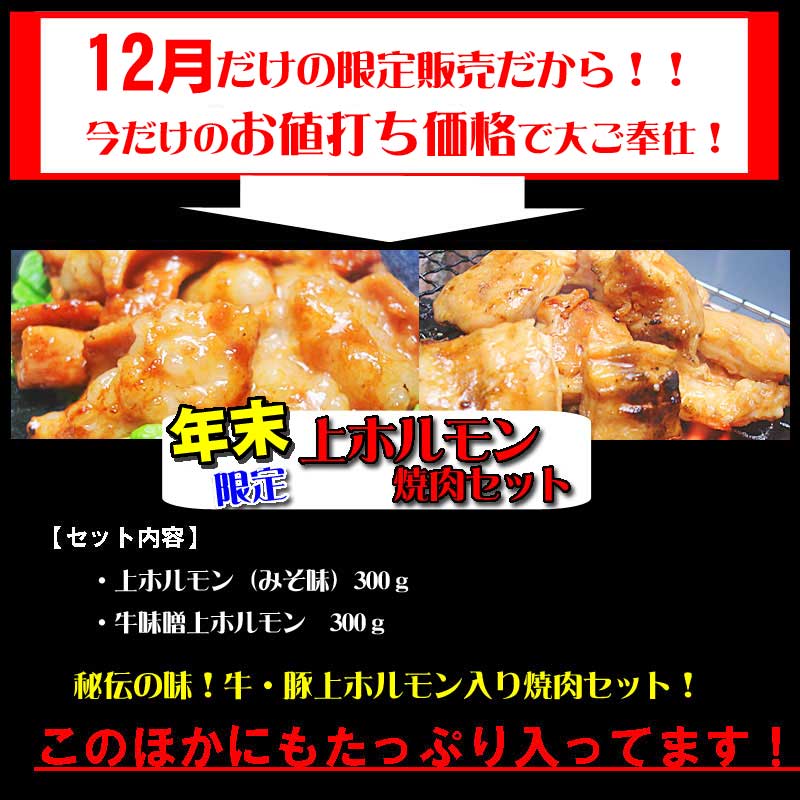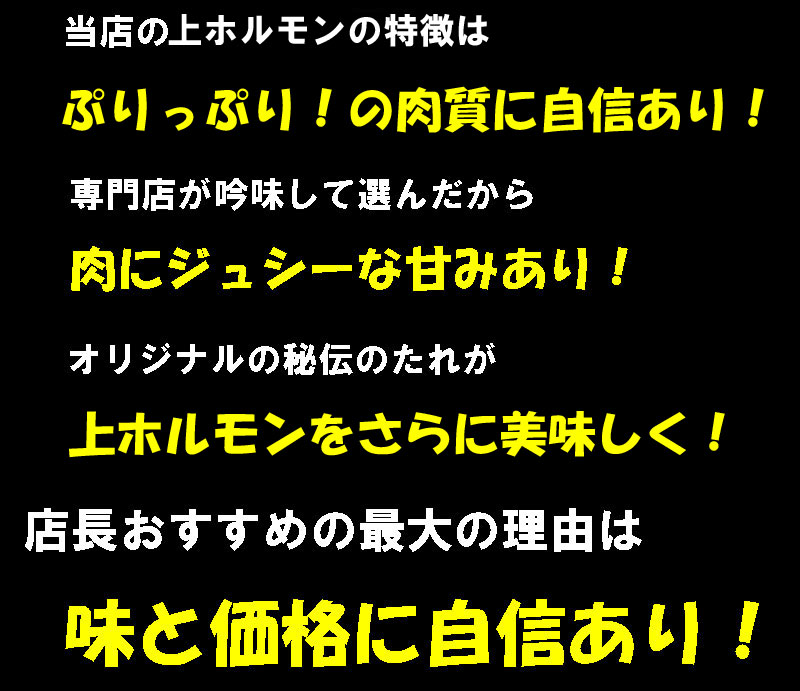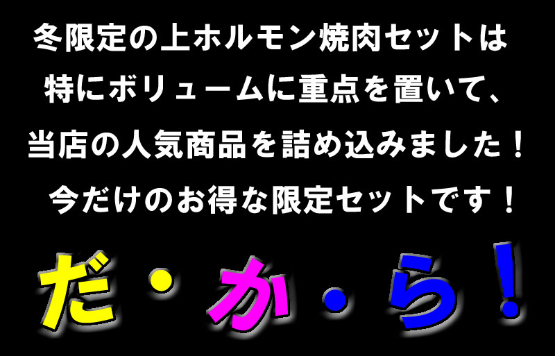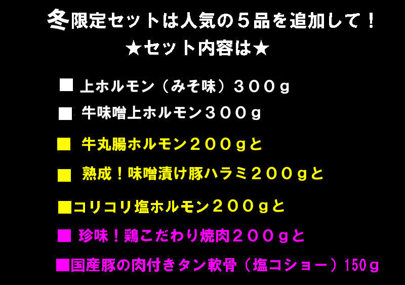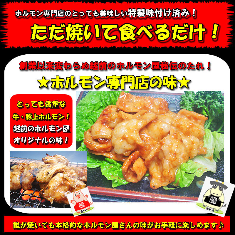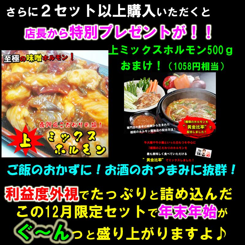 【送料無料】上ホルモン(みそ味)お試しセット3,542円(税込) 当店1番人気の”上ホルモン(みそ味)1.2kg(3袋分)”に、ホルモン屋さんのキムチ200gと、ホルモンの付けたれをセットにして、お買い求めやすい価格で、ご提供いたします。