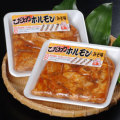 こだわりの原料は ・豚直腸・・・上シロとも呼ばれ、脂がのっておいしい。 ・コリコリホルモン・・・豚のガツ(骨)で分厚い部分だけを使用。 ・豚ハラミ・・・貴重品の豚のハラミを使用。 ・豚なんこつ・・・貴重品の豚の喉なんこつを使用。 以上の原料を自家製みそダレで味付けしてあります。上ホルモン、ミックスホルモンと比べると原料にこだわった分、おいしさもこだわりのある味になっております。 どこが”こだわりかと申しますと・・・・ その名の通り、店主がよりこだわって作りました。 そのこだわりとは・・・・! 1.新鮮な生のホルモンしか使用しない。 2.原料が、どれも1頭からわずかしかとれない貴重品の原料である。 3.店主の情熱が、この商品にあふれている。ってか!! 3番目のこだわりはさておき、上の二つは店主が苦労して仕入れています。 1頭からわずかしか取れない貴重品である原料な上、新鮮な生のホルモンということになると、なかなか手に入りません。 しか?し、店主は、ホルモン一筋創業40年という、意地と根性で、苦労して仕入れています。